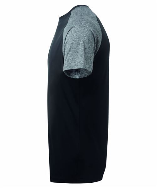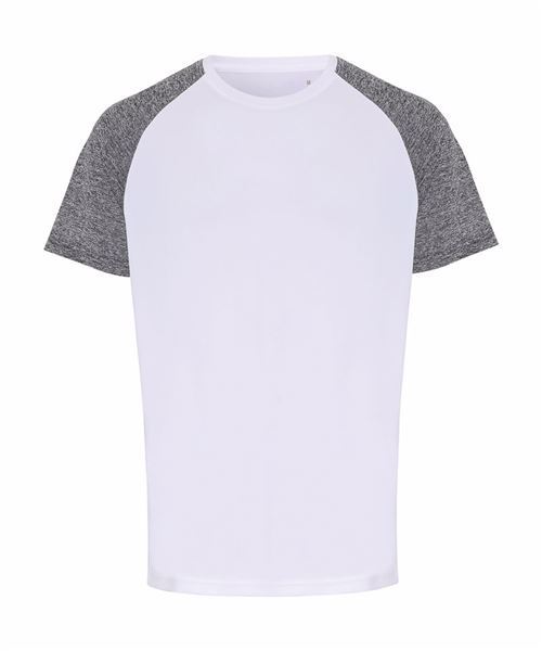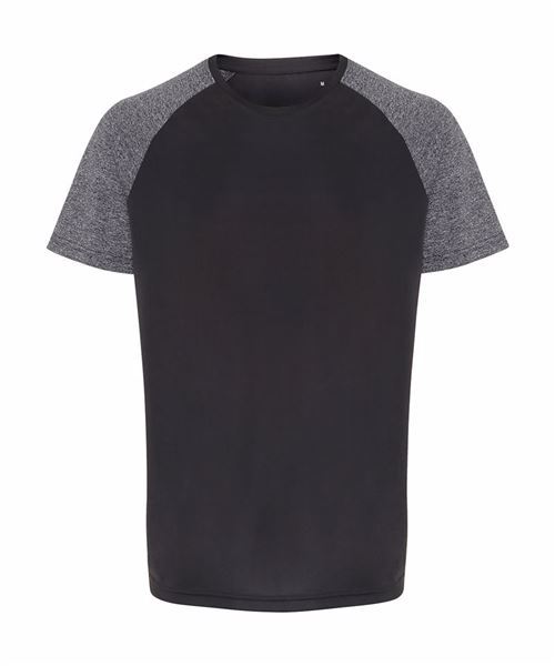 Wicking fabric. Sleeves are melange effect. Stretch. Crew neck. Short sleeve. Lightweight. Twin-needle stitching on hem and arms. We recommend using block out vinyl and inks.Product contains no branded neck or waist label. Removable Kimble or looped garment tags. Inner seam label holds important product information on one label with a second label containing brand information which can be cut-away.